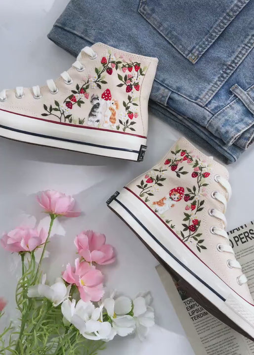 Converse Hand-Embroidered Cat and Strawberry Shoes