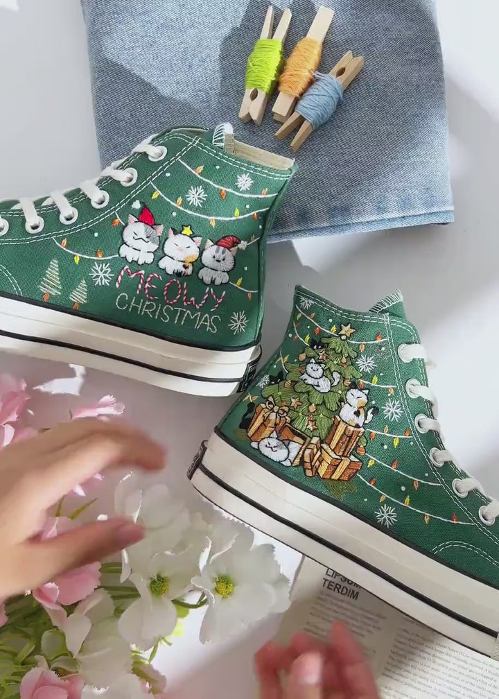 At Stitchery Zone, these shoes are a standout in the Christmas Chucks collection. The vibrant embroidery gives these sneakers a unique look. Every detail is carefully made, so each pair feels special. Wear them with jeans or dresses for a fun and relaxed vibe.