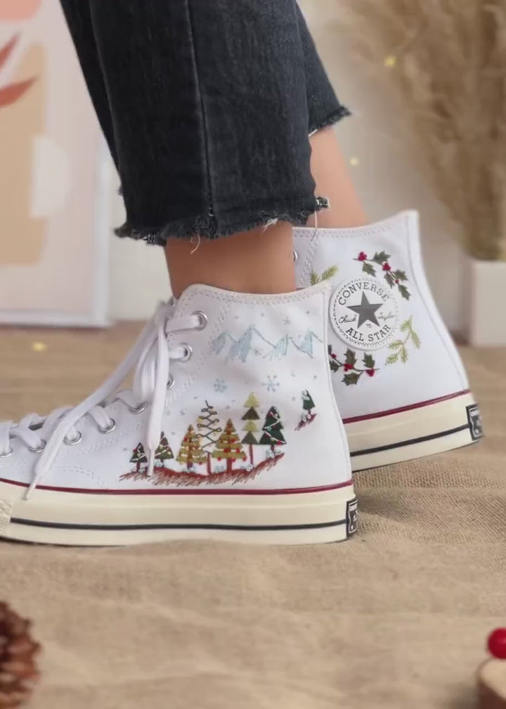Step into the festive season with unique style and flair. These Christmas Converse Shoes feature high-top design and classic comfort that Converse is known for. Each pair has delicate embroidery that brings a touch of holiday magic to your look. Trees, mountains, and wreaths are hand-stitched on crisp canvas. These details make every pair special.