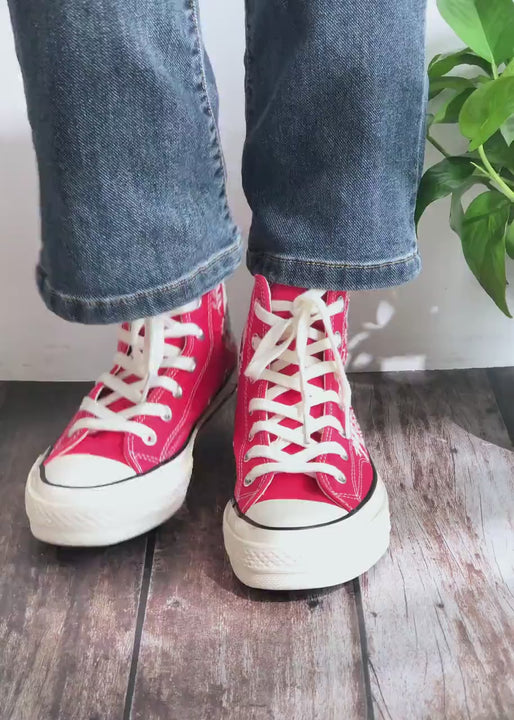 Enjoy the festive spirit with these Christmas Converse Vintage embroidered shoes. Each pair is hand-stitched with a beautiful holiday design. Bright red fabric showcases intricate snowflakes, baubles, and holly leaves. Unique embroidery adds charm to any holiday outfit. Every thread is placed with care for lasting quality and style.
