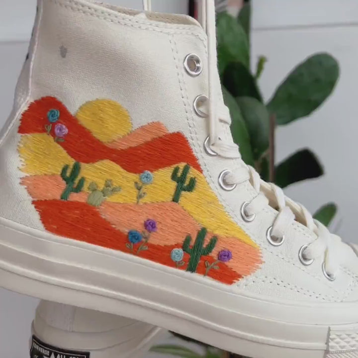 Discover the unique charm of our Converse Cactus embroidered high-top sneakers. Crafted by Converse, these shoes feature beautiful hand-stitched cactus designs that stand out. Each pair showcases an artistic touch, marrying comfort with style.
