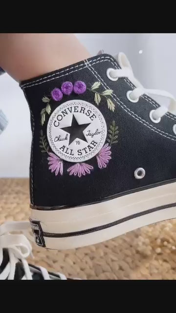 Step into a world of creativity with Stitchery Zone’s unique Purple Flowers Embroidered Shoes Women. Each pair features hand-stitched floral embroidery that adds a fresh, artistic touch to any outfit. The beautiful purple flowers stand out against classic black Converse canvas, making these shoes eye-catching and stylish.