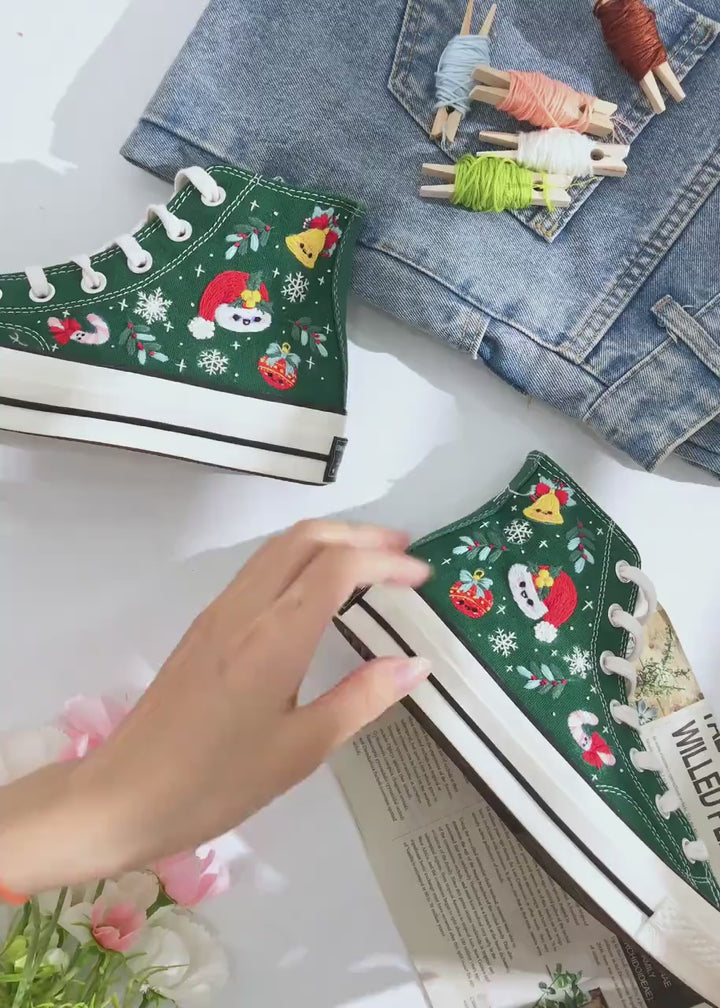 Step into the holiday spirit with Santa Claus and Reindeer Embroidered Shoes from Stitchery Zone. These Converse high-tops feature detailed embroidery that makes each pair unique. Hand-stitched designs show Santa and his cheerful reindeer, surrounded by delicate floral accents and festive touches. The green canvas base adds a bold, classic backdrop that lets the embroidery stand out.