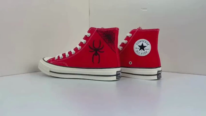Spider Web Shoes are the perfect mix of classic style and bold design. The red canvas base contrasts with black embroidery. Laces and soles offer solid support. Quality materials keep your feet comfortable. These shoes work well for casual outings or special occasions.