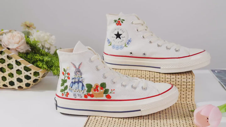 Step into style with our Strawberry Converse Embroidered High-Top Sneakers. Crafted by the renowned brand Converse, these sneakers offer a delightful blend of comfort and charm. The standout feature is the hand-stitched floral embroidery, making every pair unique and eye-catching.
