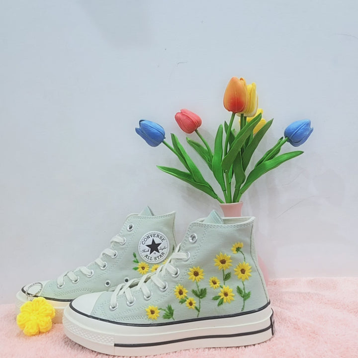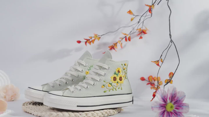 Each pair of sneakers is hand embroidered with your chosen design by Stitchery Zone.