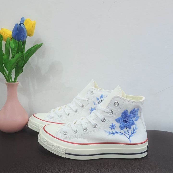 Hãy bước vào ngày trọng đại của bạn với Giày Cưới Converse, một sự kết hợp độc đáo giữa phong cách và sự thoải mái. Đôi giày cổ cao này được thêu tay tinh tế. Họa tiết hoa trắng tinh tế chạy dọc hai bên thân giày. Mỗi đôi giày đều được đội ngũ Stitchery Zone chế tác tỉ mỉ. Chất liệu vải canvas trắng mang đến vẻ đẹp cổ điển. Những bông hoa xanh dịu dàng mang đến nét chấm phá kỳ ảo. Đây là lựa chọn hoàn hảo cho cô dâu yêu thích phong cách cá nhân.